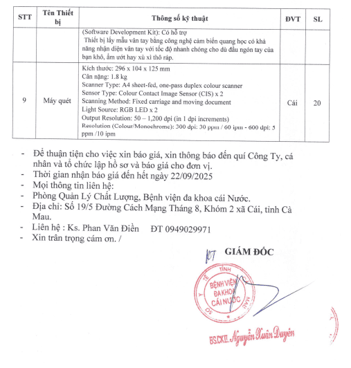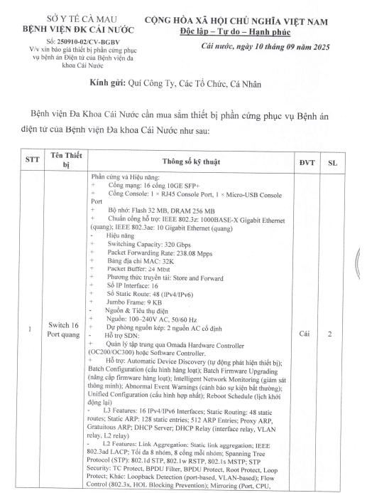 xin báo giá thiết bị phần cứng phục vụ bệnh án Điện tử của Bệnh viện đa khoa Cái Nước14:49:00 10/09/2025