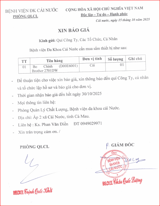 xin báo giá thiết bị phần cứng phục vụ bệnh án Điện tử của Bệnh viện đa khoa Cái Nước