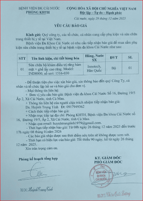 xin báo giá thiết bị phần cứng phục vụ bệnh án Điện tử của Bệnh viện đa khoa Cái Nước
