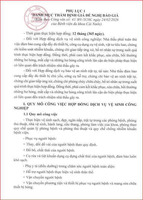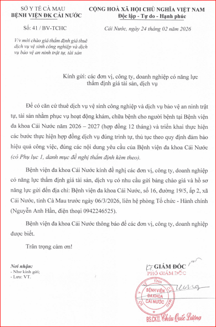 V/v mời chào giá thẩm định giá thuê dịch vụ vệ sinh công nghiệp và dịch vụ bảo vệ an ninh trật tự, tài sản14:19:00 26/02/2026