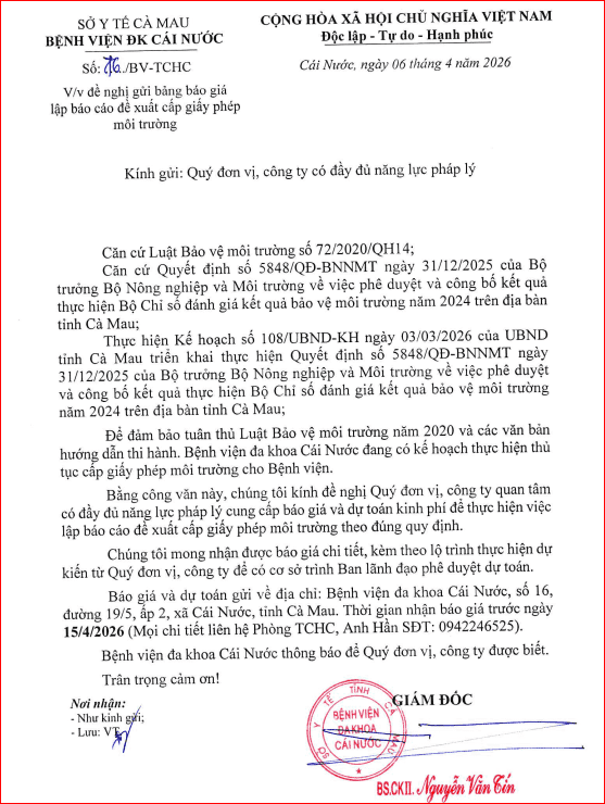 Đề nghị gửi báo giá lập báo cáo đề xuất cấp giấy phép môi trường14:52:00 06/04/2026